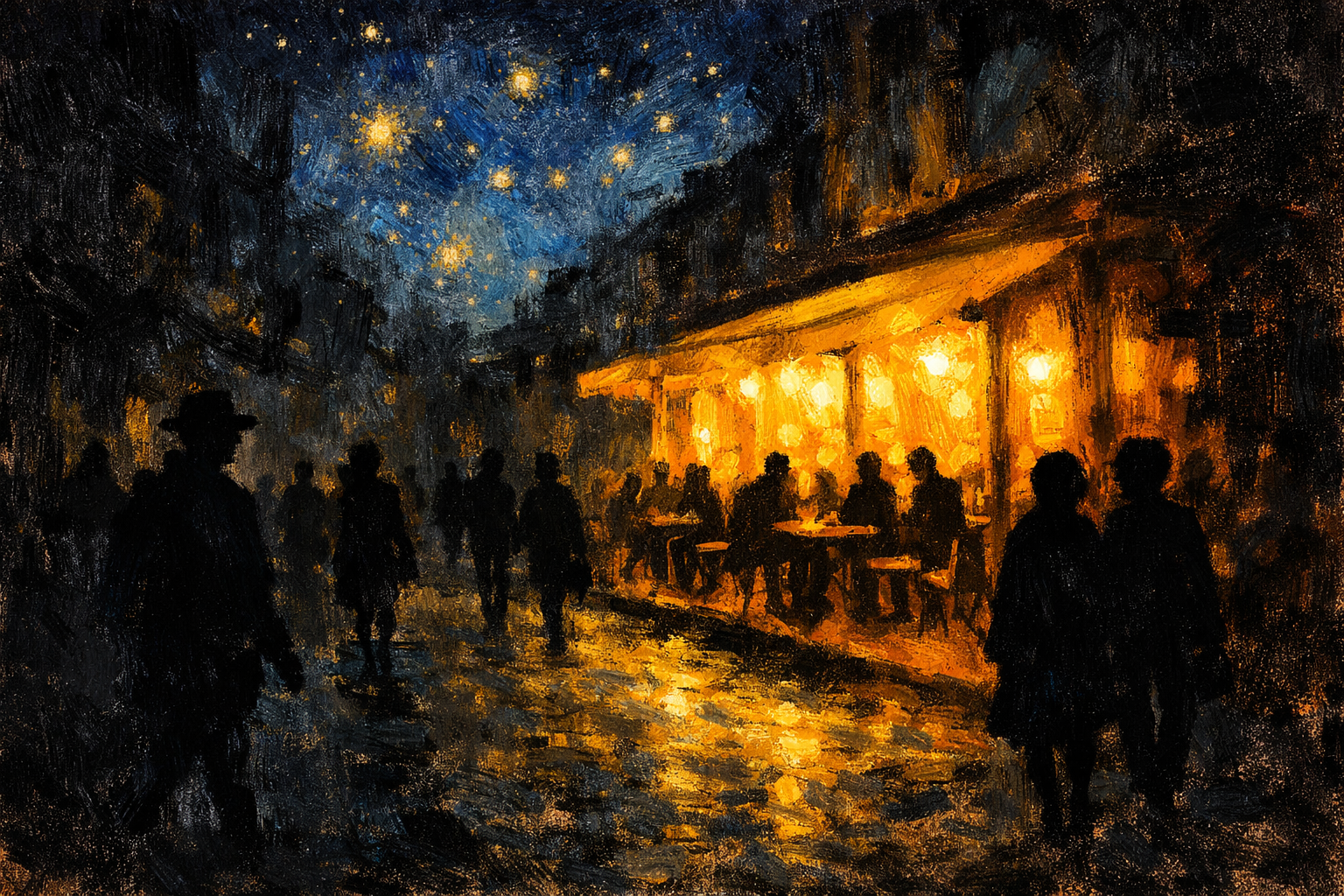 ですが、細部まで描き込みすぎないことで、 見る側に余白を残しています。 「夜のカフェテラスなんて、こんなものだろう」 と思わせてくれる自然さがあります。